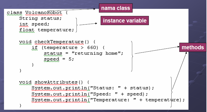 Definisi class yaitu template untuk membuat objek. Class merupakan prototipe atau blue prints yang mendefinisikan variabel-variabel dan method-method secara umum. Objek merupakan hasil instansiasi dari suatu class. Proses pembentukan objek dari suatu kelas disebut sebagai instantiation. Objek disebut juga sebagai instances.